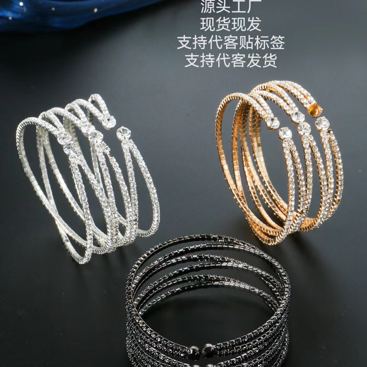 Cross-border Europe and the United States black personality trend elastic rhinestone opening bracelet daily Joker ins wind hand jewelry manufacturers