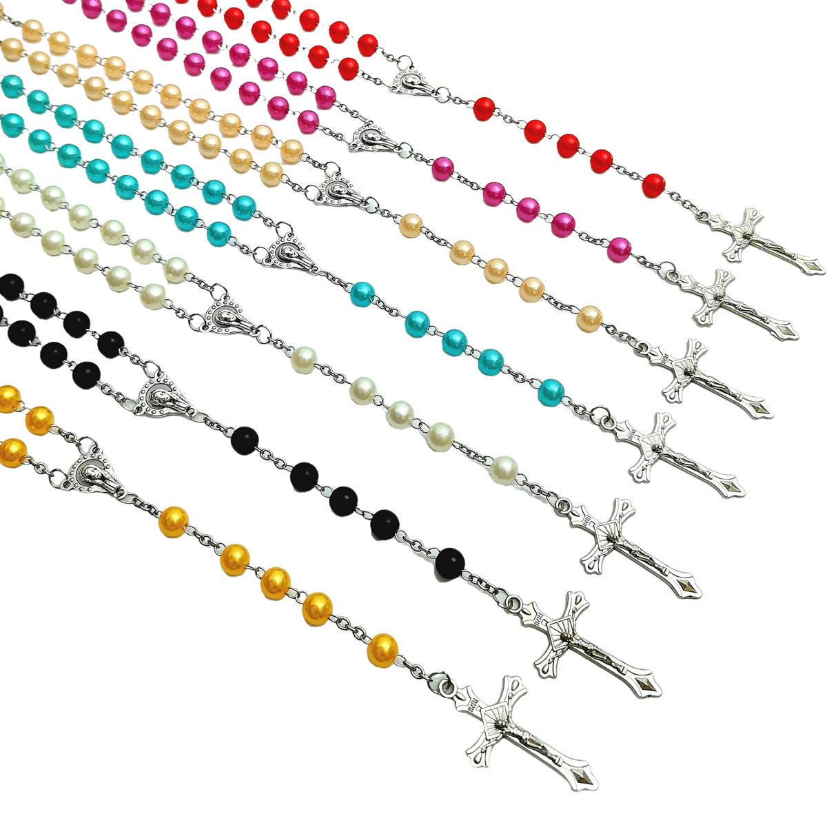 Manufacturer's Supply Multi-Color Round Bead Rosary Necklace Men's and Women's Long Imitation Pearl Necklace Cross Necklace in Stock
