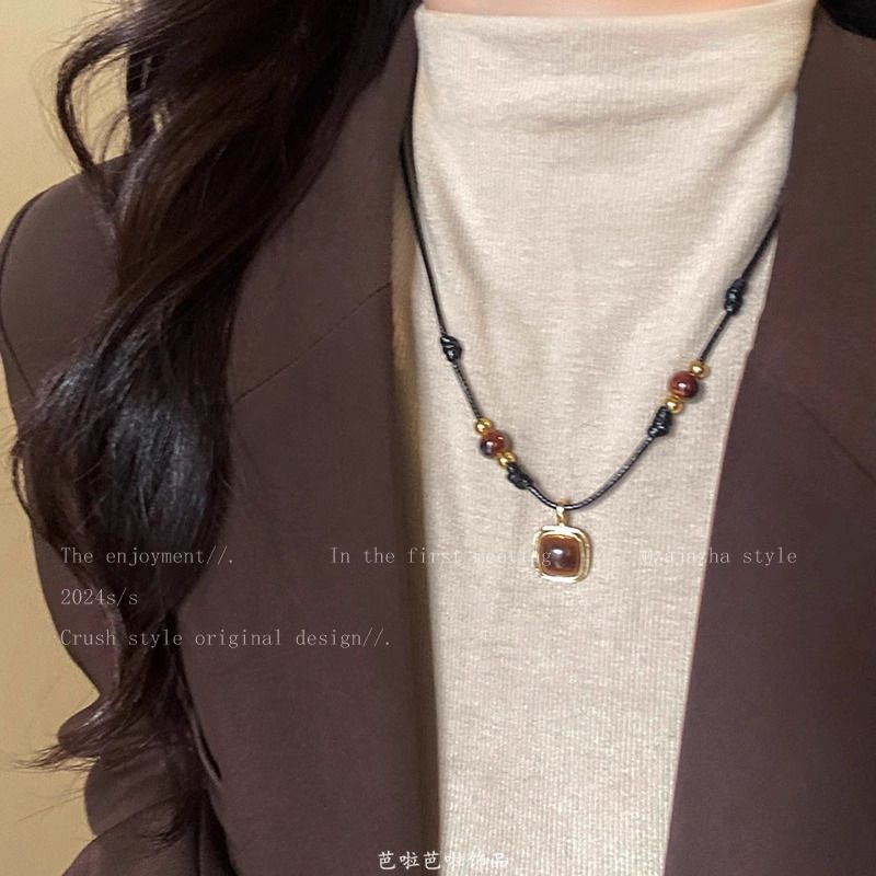 Tiger Eye Stone Braided Leather Cord Necklace for Women, Fall/Winter 2025 New Popular Sweater Chain, Vintage Style Versatile Accessory