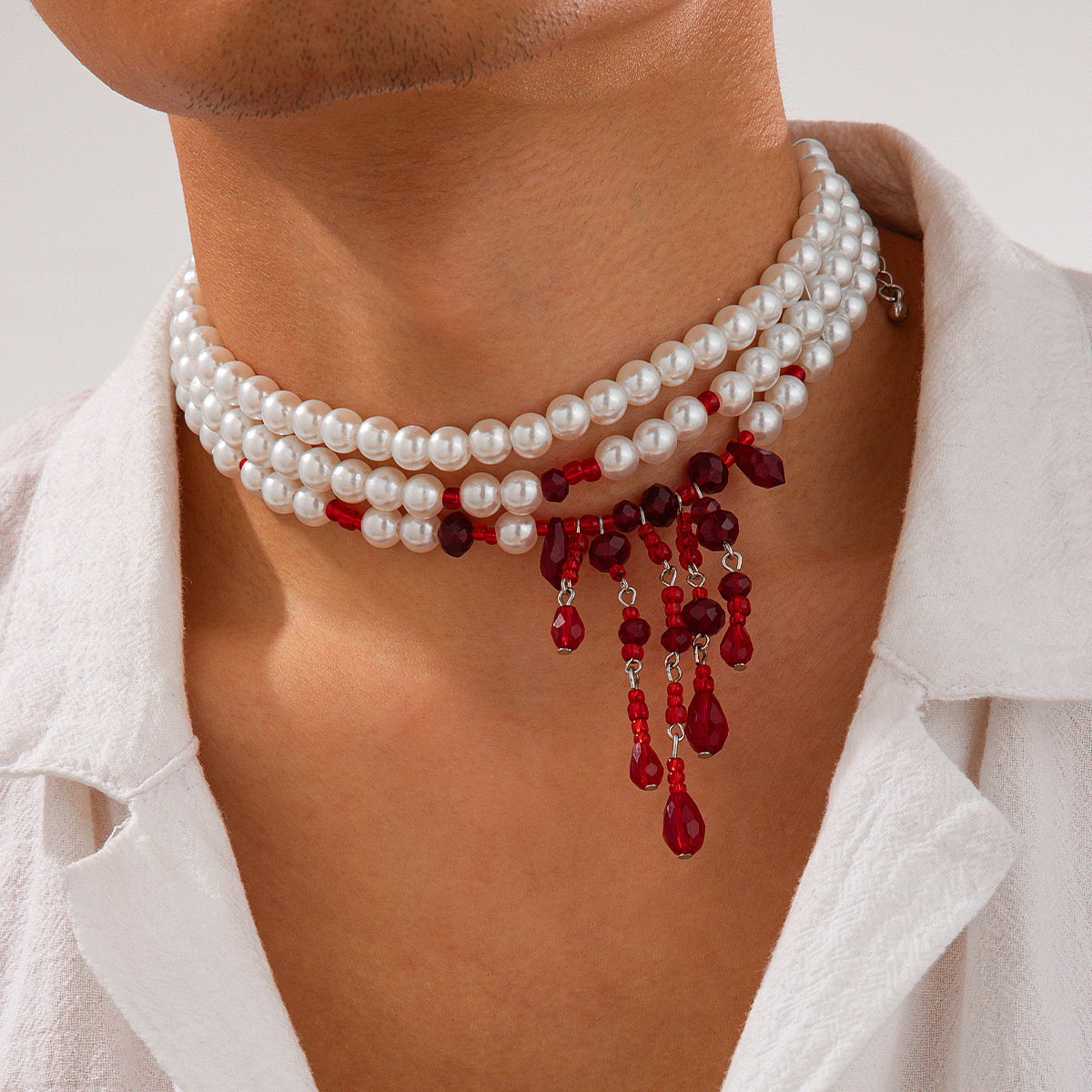 European and American Halloween Blood Dropping Tassel Pearl Crystal Necklace Men's Trendy Hip Hop Niche Street Exaggerated Multi-layer Clavicle Chain