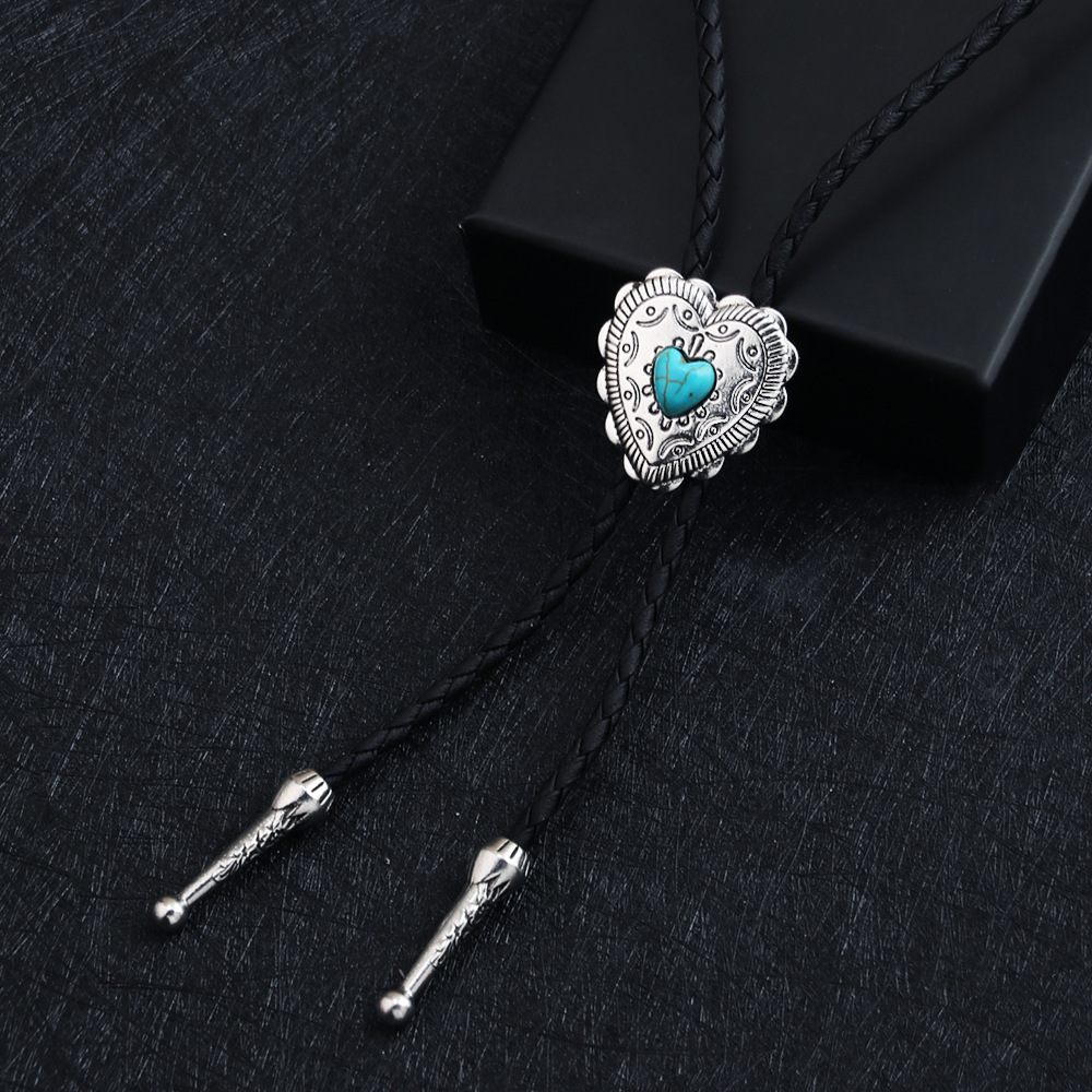 European and American cross-border punk Denim bolo tie fashion personality love blue turquoise leather rope sweater chain alloy pendant