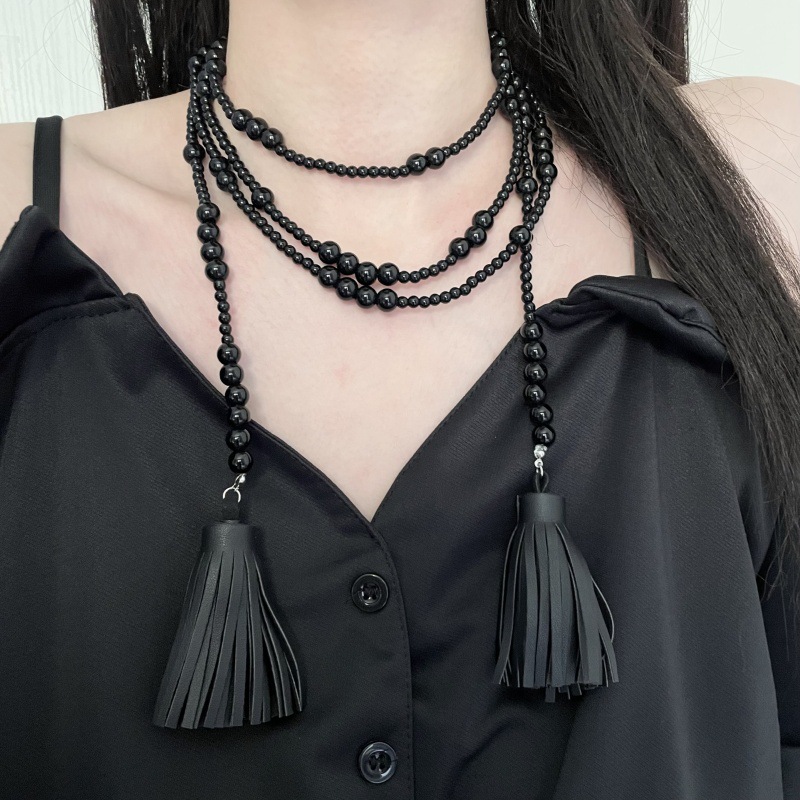 New Vintage Chinese Style Size Black Round Bead Long Tassel Stacked Multi-Layer Necklace Women's Various Wearing Style Clavicle Chain