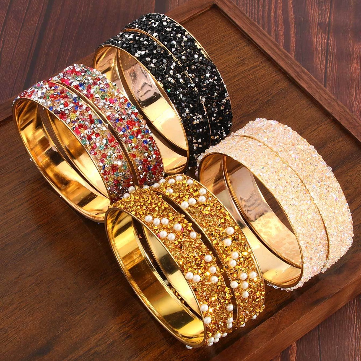 Fashionable Crushed Diamond Imitation Pearl Bracelet 2-Piece Set with Edge Design, Light Luxury Sequin Open Rose Gold Diamond Geometric Ornament