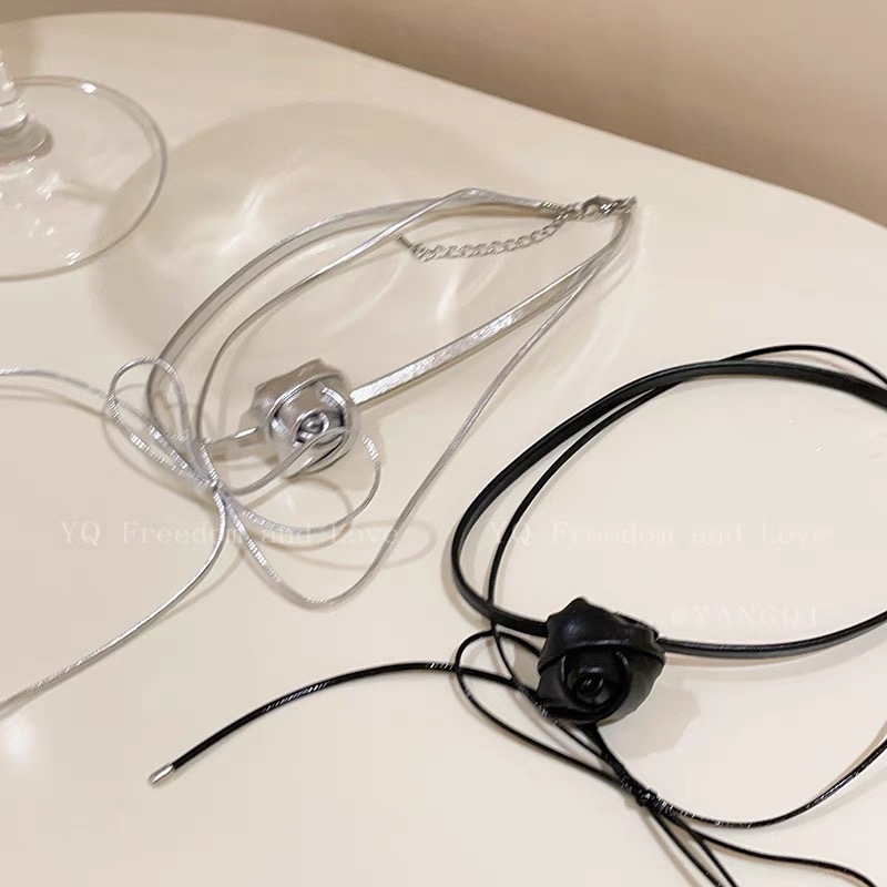 Silver Grey Bow Rose Choker Lace-up Neck Chain Niche Sweet Cool Spice Chain Trendy Cool Necklace Accessories