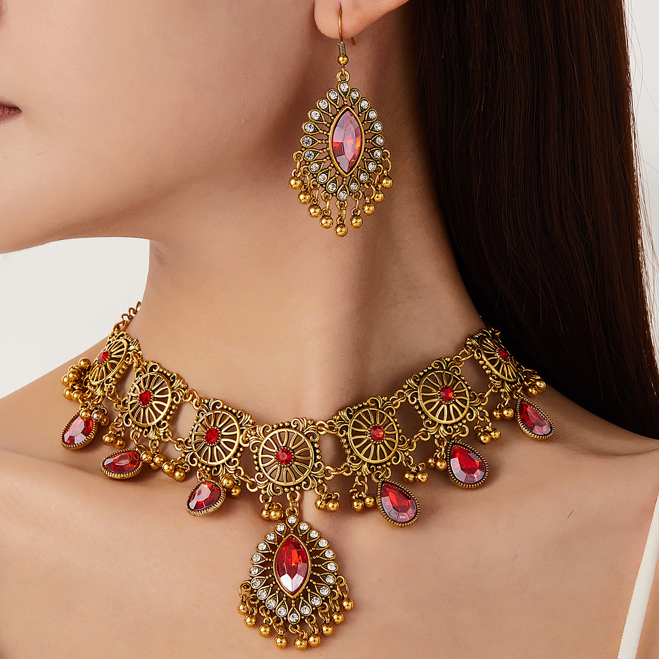 Cross-border European and American fashion Middle East ethnic style retro hollow simple temperament exaggerated women's necklace earrings suit jewelry
