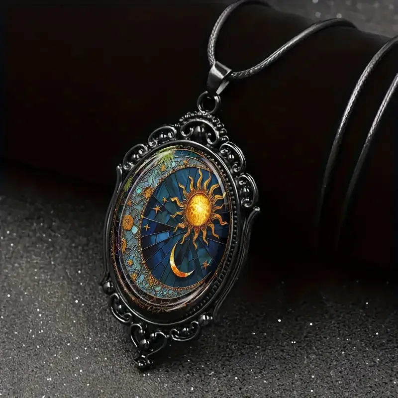 Charming Oval Glass Pendant Necklace-Sun and Moon Jewels in a Charming Black Frame