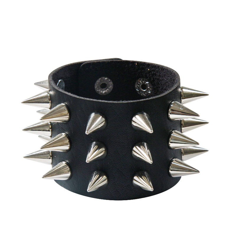 European and American Cross-border Punk Style Bracelet Non-mainstream Exaggerated PU Bracelet Three-row Tapered Pointed Rivet Dark Leather Bracelet