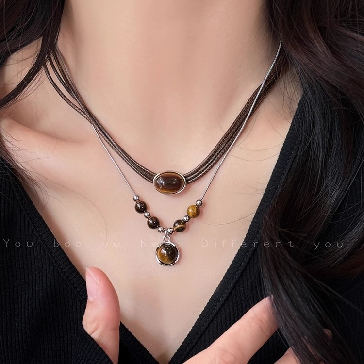 Leather Tiger Eye Necklace Women's Light Luxury Overlapping Necklace High-end Niche Clavicle Chain Vintage Double-layer Necklace Accessories