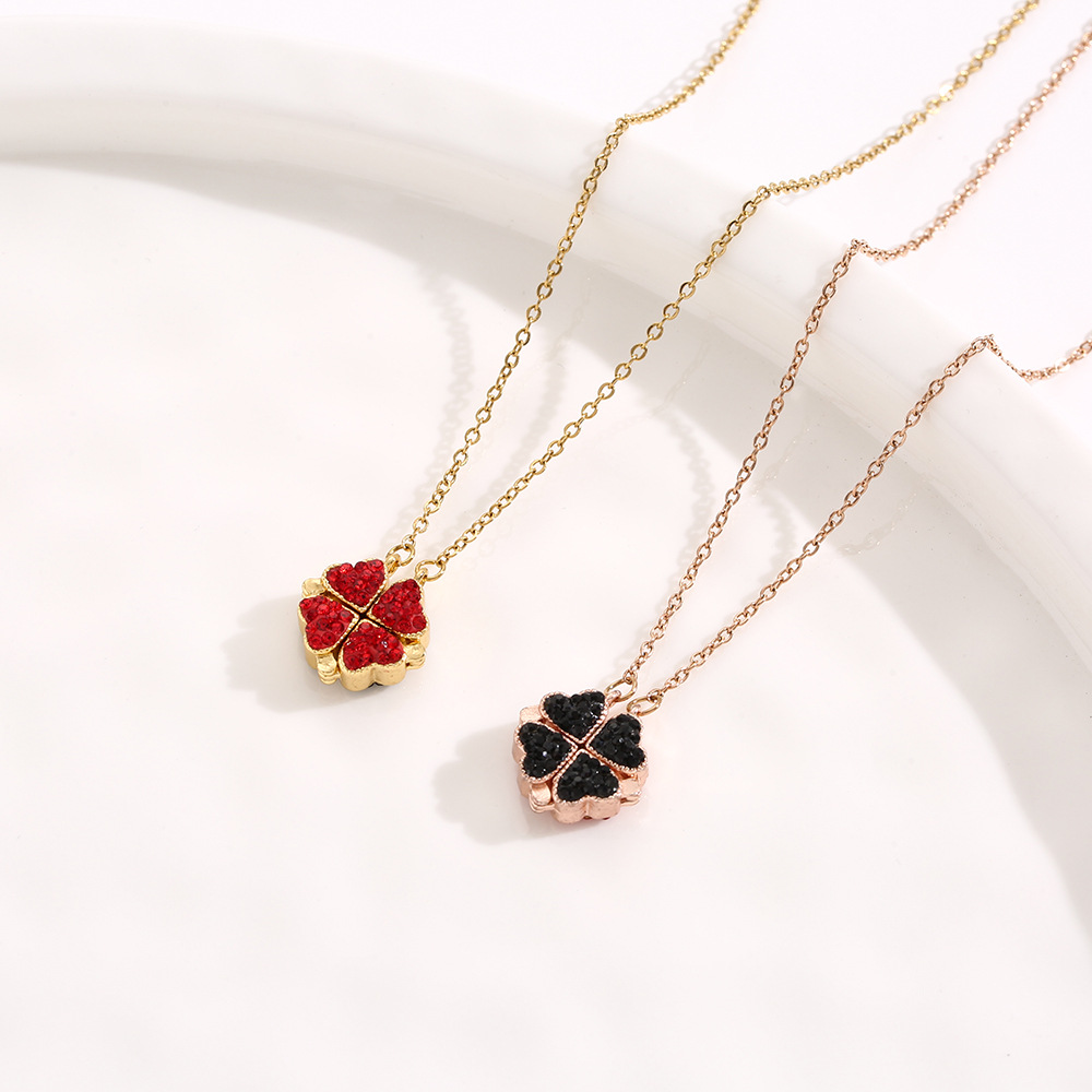 Korean Version Hot-Selling Titanium Steel Necklace for Women, Double-Wear Diamond-Encrusted Red and Black Heart Four-Leaf Clover Pendant, High-End Clavicle Chain Jewelry