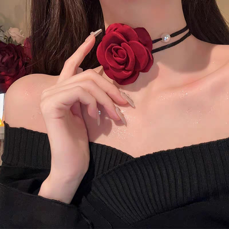 Ankora Red Rose Necklace Women's Jewelry Camellia Lace Collar Choker Pearl Clavicle Chain