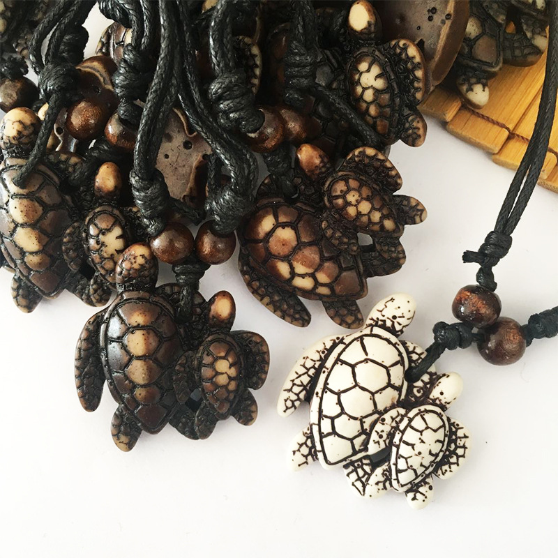 Vintage Mother and Son Tortoise Resin Pendant Necklace Ethnic Style Woolen Chain Pendant Cute Small Animal Jewelry Necklace