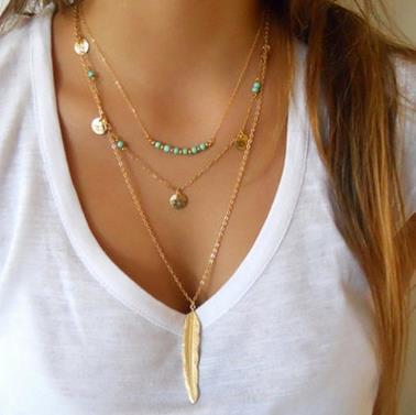 European and American cross-border fashion style necklace retro simple turquoise beaded sequins multilayer leaf necklace wholesale