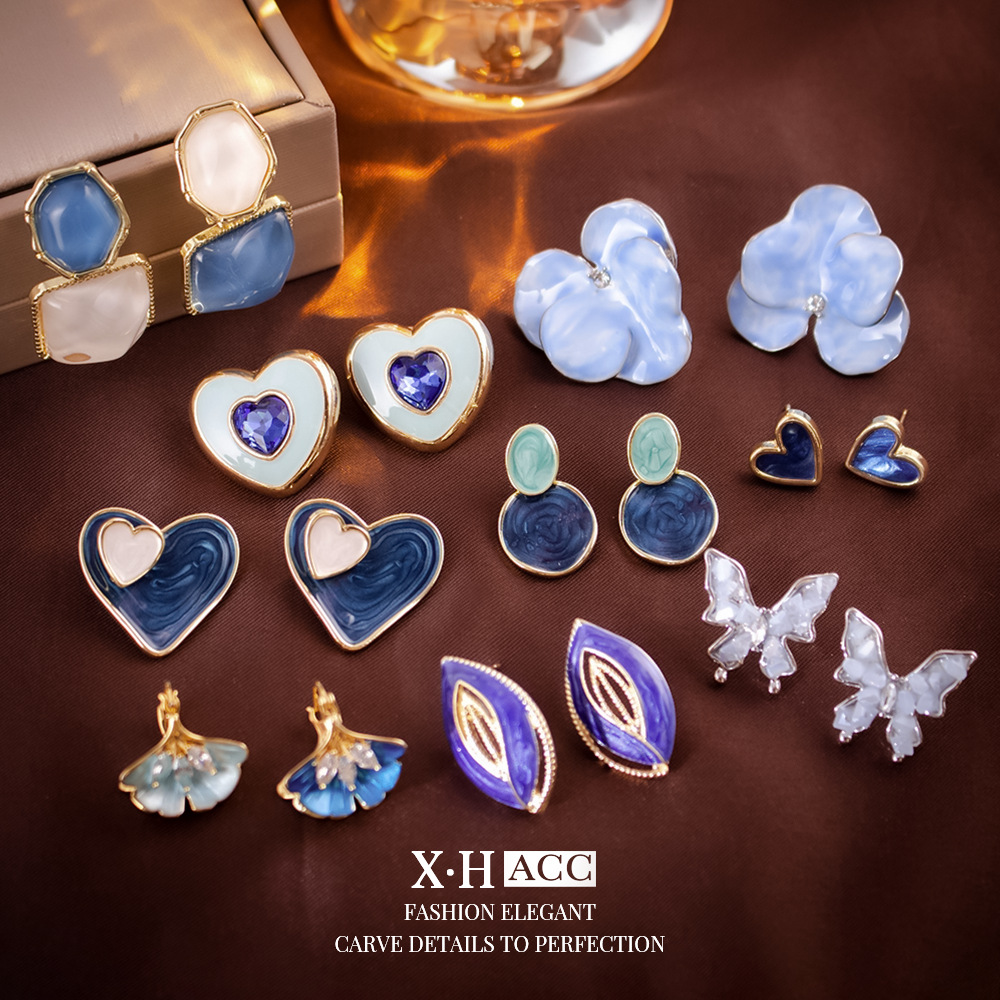 Advanced Sense Blue Drop Oil Earrings Niche Design Spotted Ear Studs Ins Fashionable Whiteness Elegant Earrings