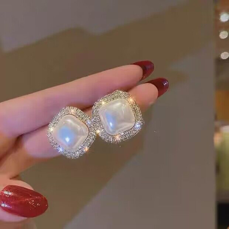 Fashion high-grade square double-layer rhinestone edge imitation pearl stud earrings female niche design geometric square earrings