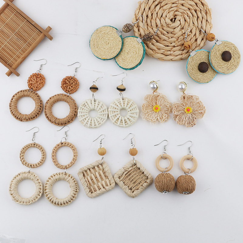 Bohemian holiday style raffia tassel earrings European and American fresh spring and summer rattan earrings cross-border earrings for women