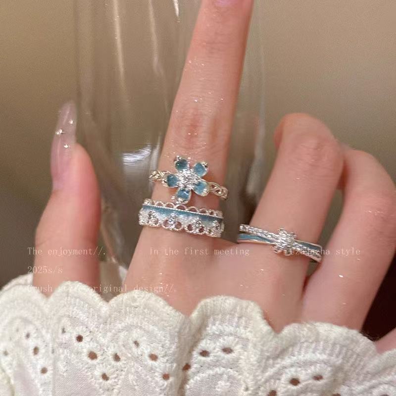 Flowers Bloom on Your Fingertips ~ Blue Drip Glaze Lace Stacked Ring for Women Niche Design Open Adjustable Index Finger Ring
