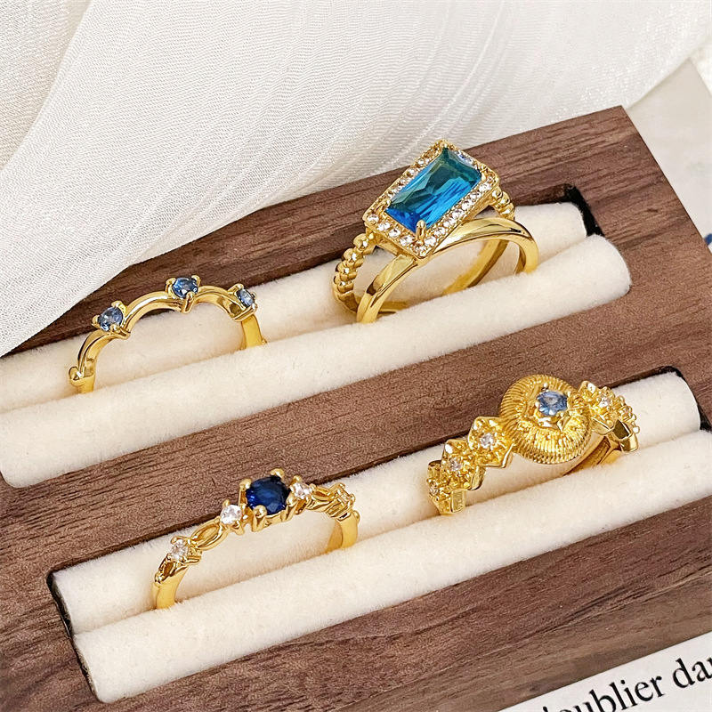 Golden Vintage Wire-drawing Middle Ancient Opening Ring Color Treasure Blue Zircon Diamond Exquisite High-end Light Luxury Ring for Women