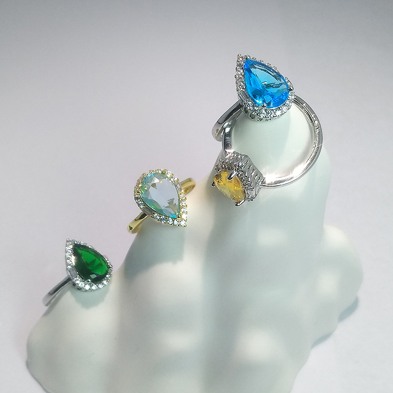 Imitation Sapphire Drop-Shaped Ring Cross-Border Supply Wholesale Blue Topaz Drop Diamond Ring Emerald Open Ring