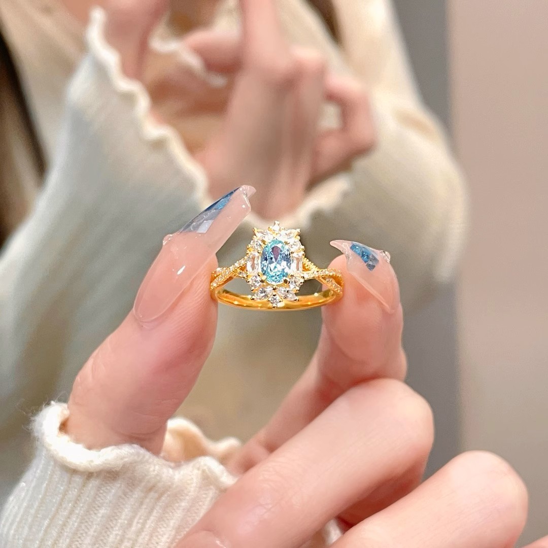 Cross-border French Court Niche Sea Blue Crystal Lace Hollow Pattern Full Diamond Light Luxury All-match High-end Ring