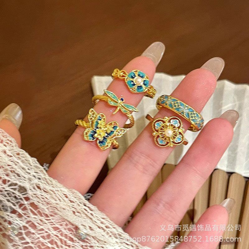 Golden Luster Medieval Style Colorful Enamel Butterfly Flower Open Ring for Women Fashion Niche Elegant Light Luxury Ring