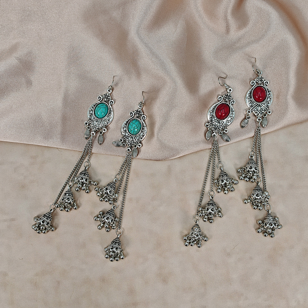 European and American Retro Ethnic Style Blue Turquoise Earrings Women's Long Retro Bell Tassel Earrings silver Alloy Earrings