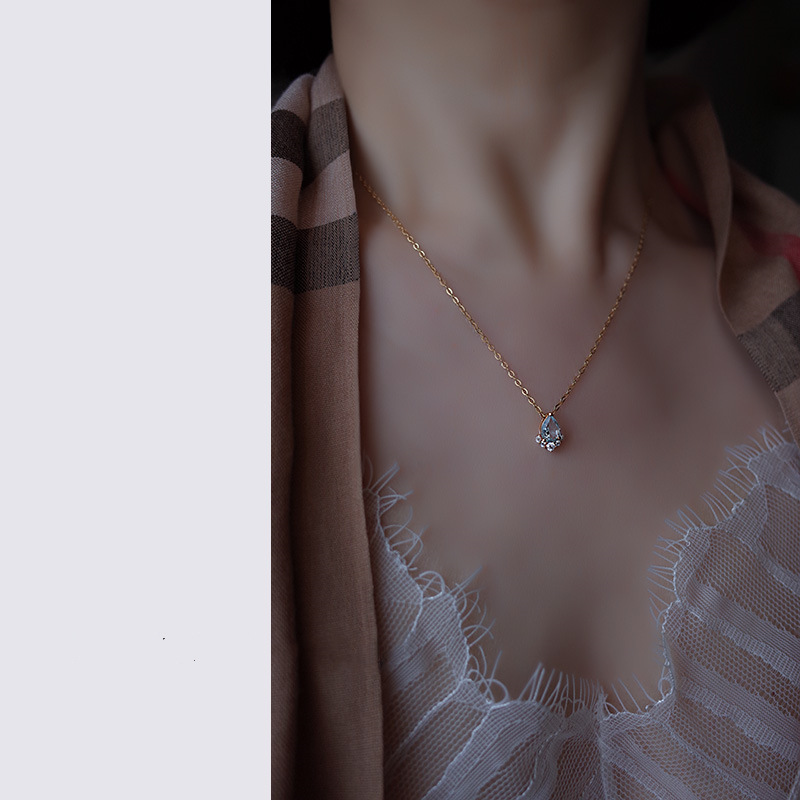 S925 Sterling Silver Gold-Plated Necklace for Women, Simple Elegant Drop-Shaped Sky Blue Zircon Pendant Clavicle Chain