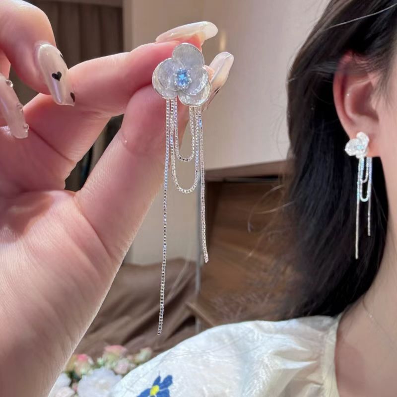 Super Fairy Sweet Blue Zircon Camellia Tassel Earrings for Women, High-End Elegant, Long Earrings, Accessible Luxury Earrings, Trendy