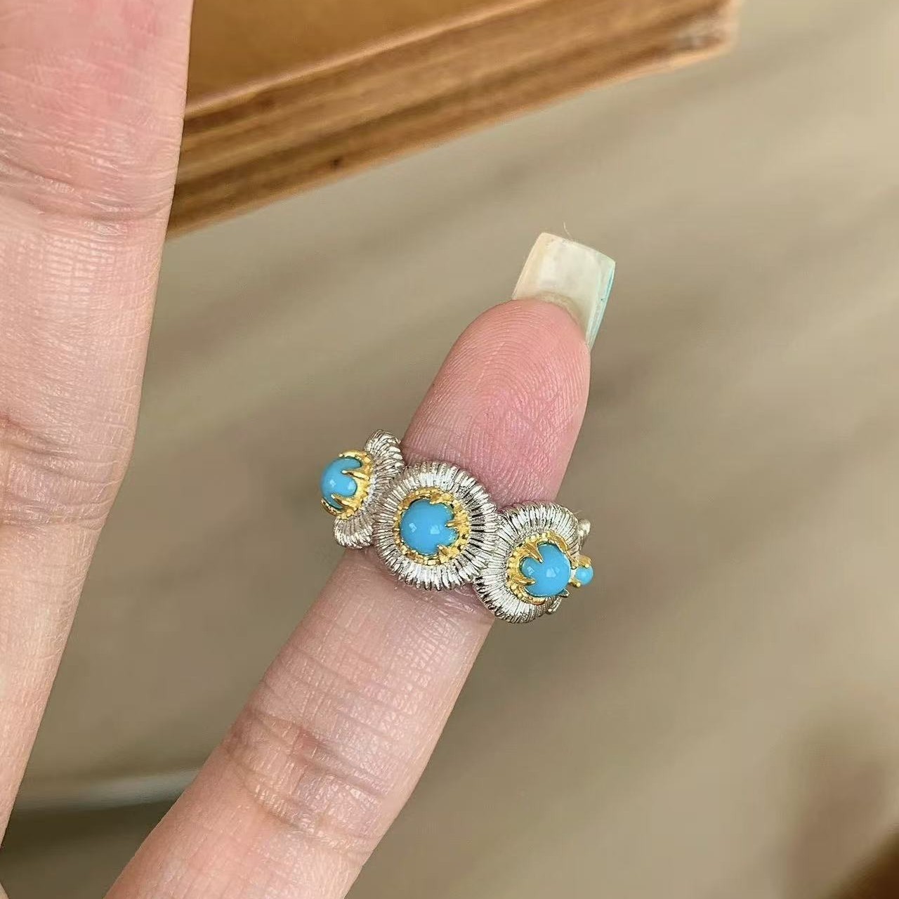 Italian Vintage Blue Turquoise Brushed Daisy Ring Exquisite Retro High-End Niche Index Finger Ring for Women