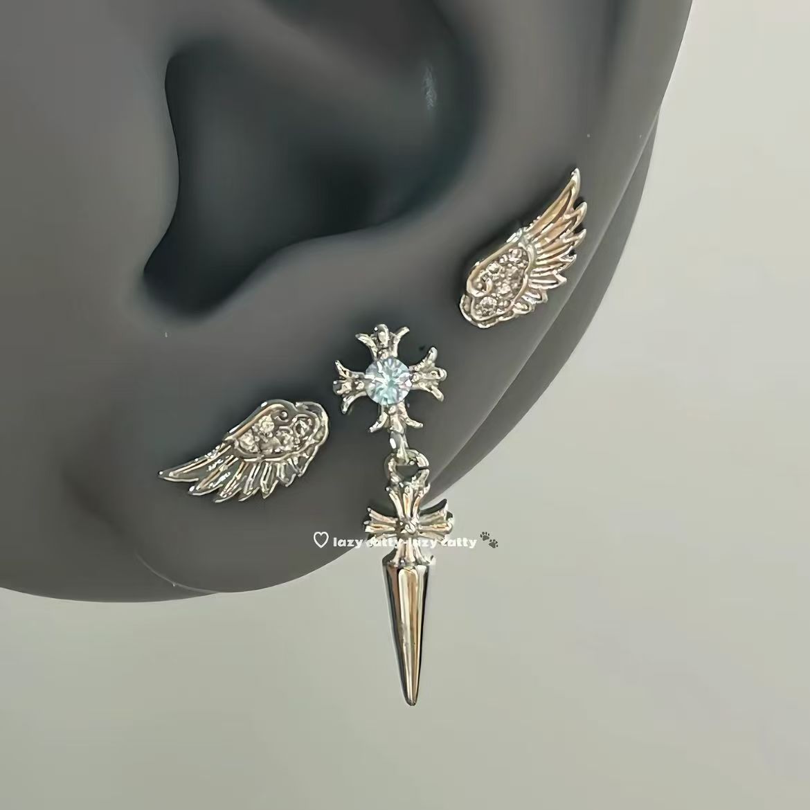 Orange Sea Sweet Cool Style Blue Zircon Cross Ear Bone Nail Unique Titanium Steel Pointed Cone Pendant Earrings Earrings