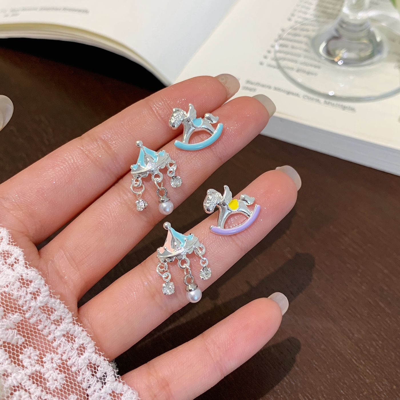 Colorful Rotating Pearl Pony Stud Earrings for Women, Silver Needle, Exquisite Design, Girly Cartoon Sweet Earrings