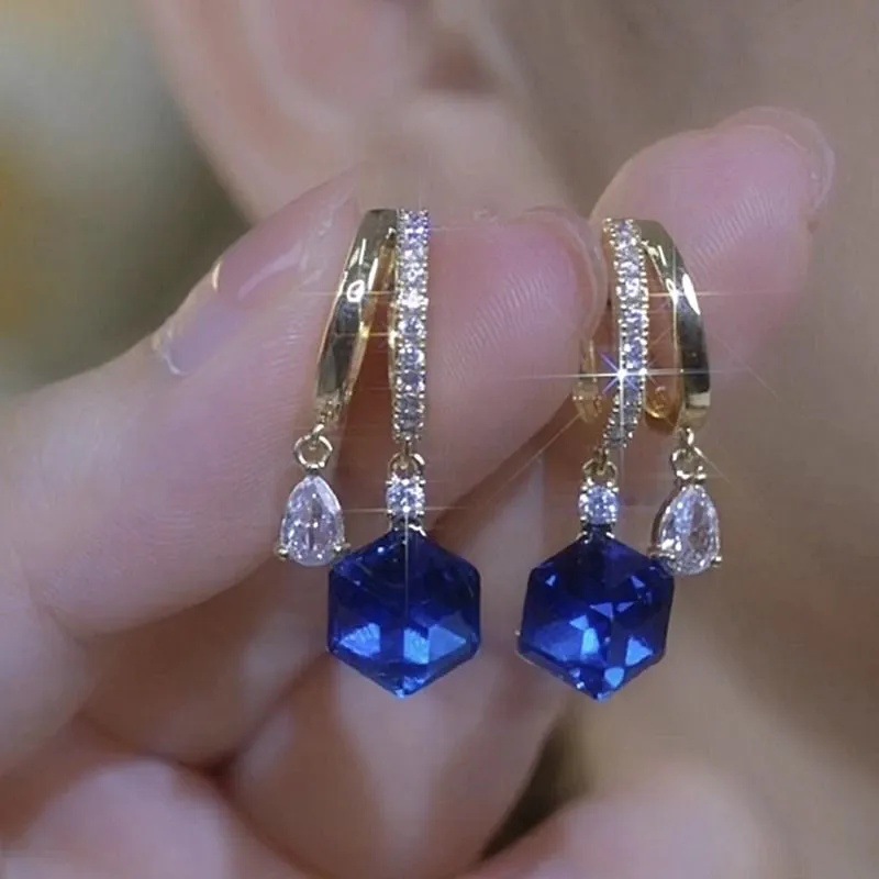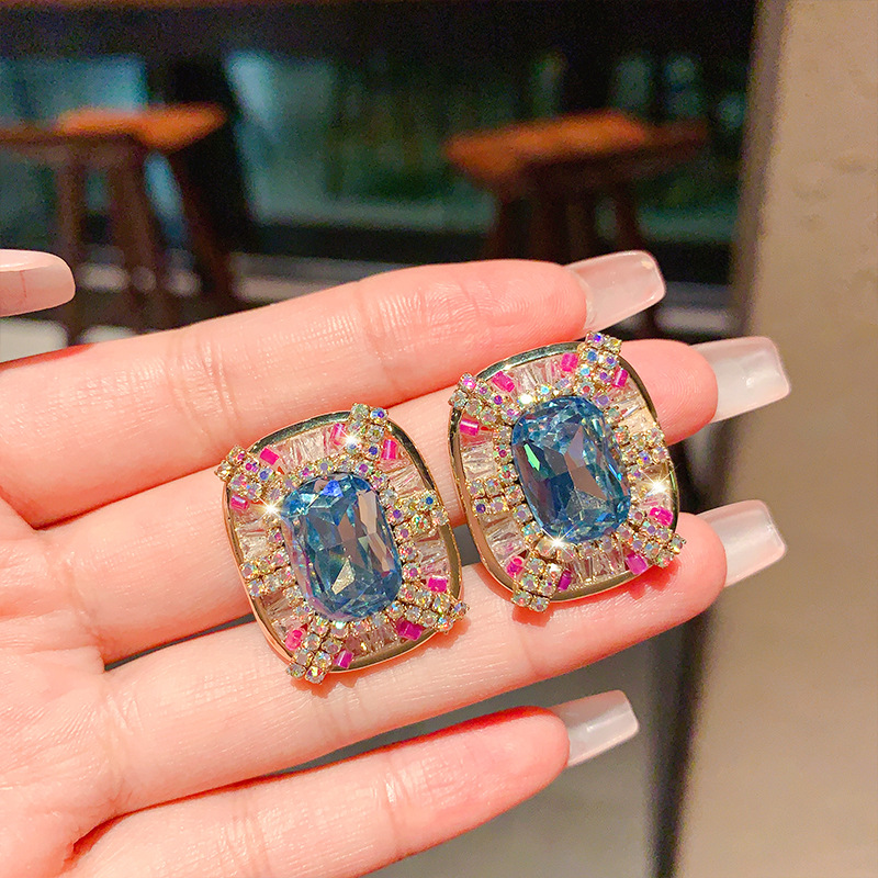 Light Luxury Middle Ancient Earrings Micro-inlaid Blue Color Zircon Earrings Women's Niche Rectangular s925 Silver Needle Diamond Earrings New Style