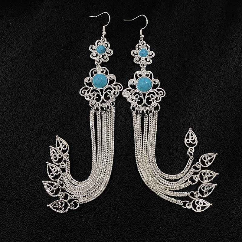 Mongolian Element Tassel Earrings Women's Special Imitation Turquoise Ethnic Style Tassel Earrings Mongolian Long Earrings
