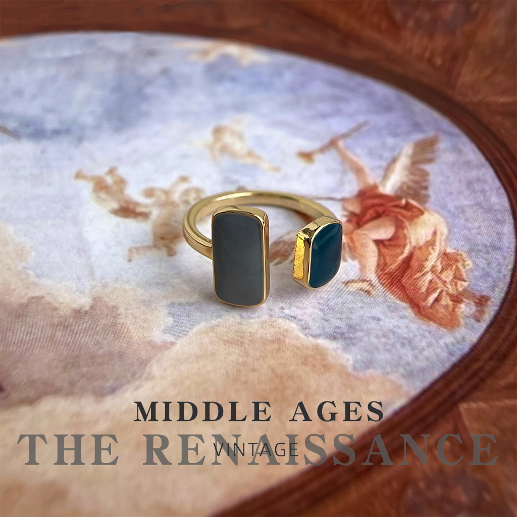 Vintage Light Mid-Century High-End Retro Square Geometric Ring Hong Kong Style Haze Blue Open Index Finger Ring