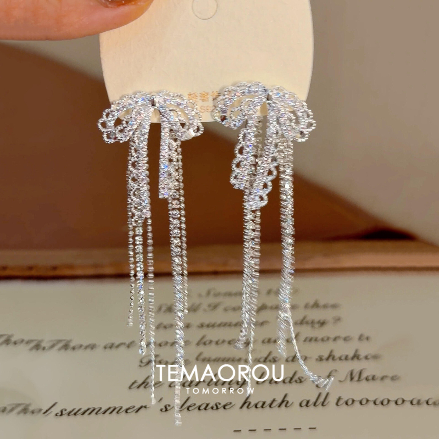 Diamond Bow Tassel Earrings, Accessible Luxury, High-End Earrings, Feminine, Fashionable and Versatile Earrings, Niche Design