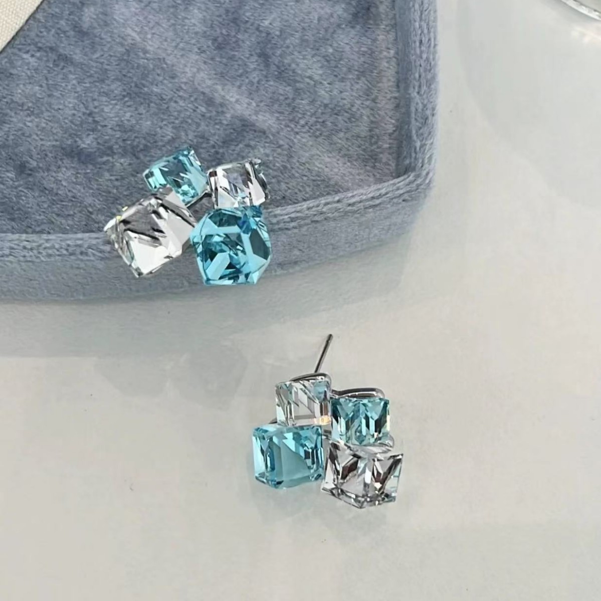 Korean Blue Stereo Crystal Geometric Sugar Cube Earrings Super Flash Design Earrings Niche Simple Clear Earrings