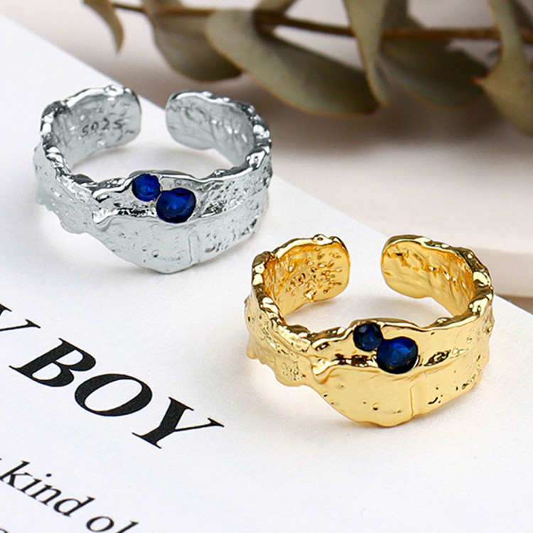 Korean Design Ins Irregular Texture Ring Opening Personalized Concave and Convex Blue Zircon Ring Female Popular Jewelry