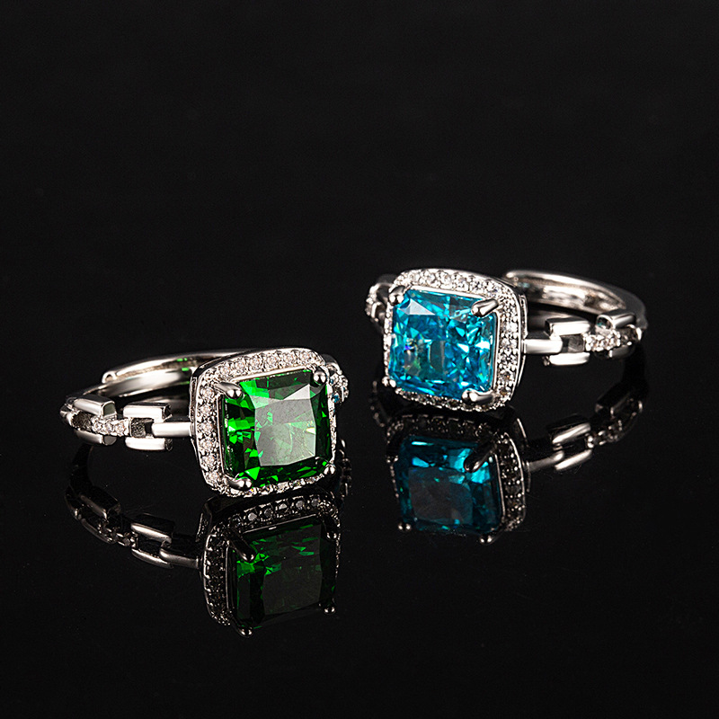 European and American Style Luxury High Carbon Diamond Square Sea Blue Ring Female Celebrity Style Fashion Color Treasure Ice Flower Cut Zircon Ring