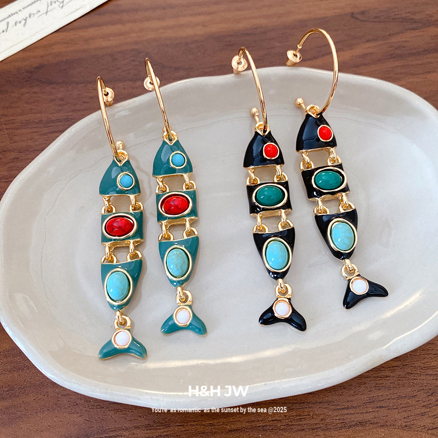 Silver Needle Spanish Vintage Enamel Fish Tassel Earrings, Fashionable and Unique Earrings with a Sense of Design and Niche Appeal