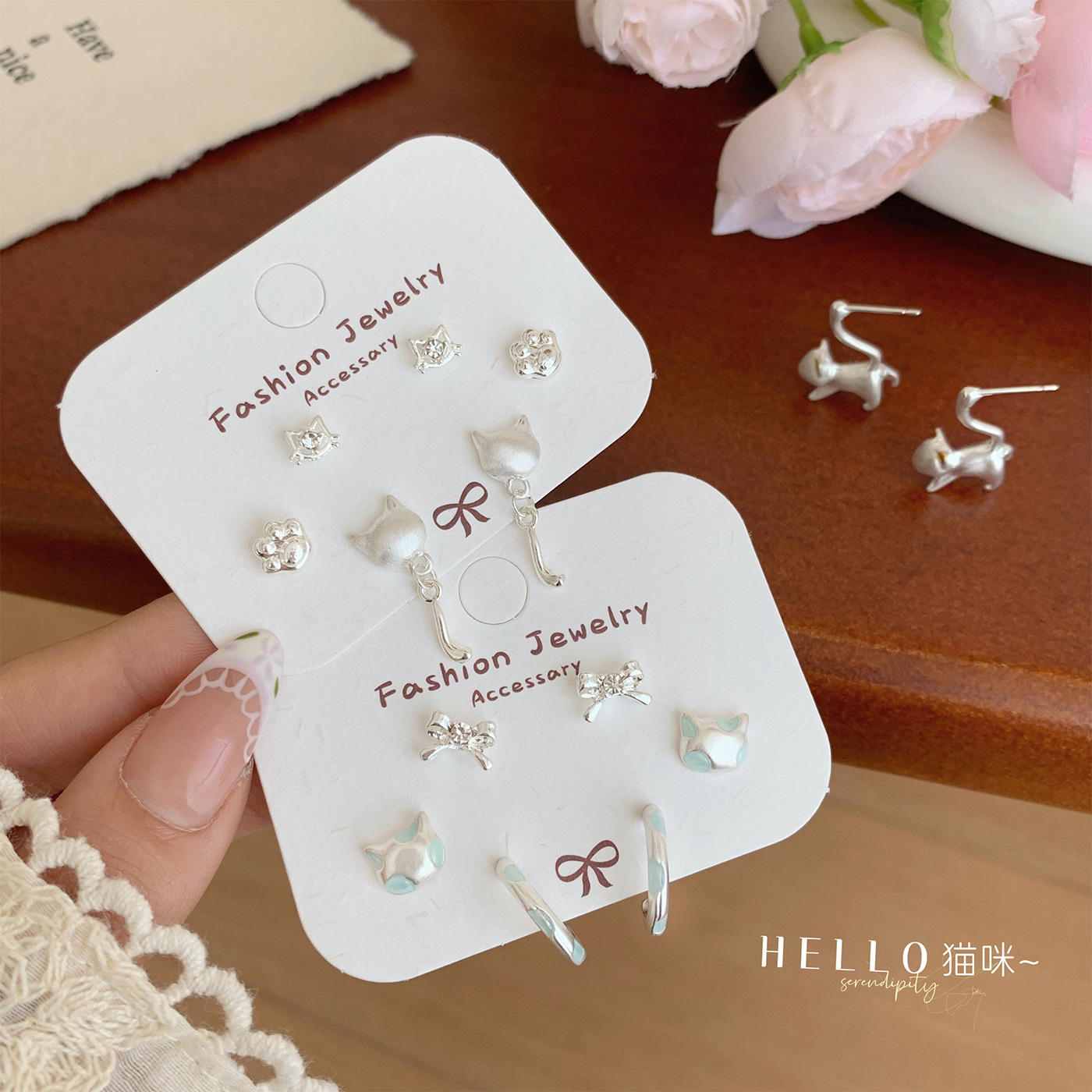 Simple Cute silver Silver Kitten Earrings Women's Silver Needle Niche Design Exquisite Animal suit Student Earrings