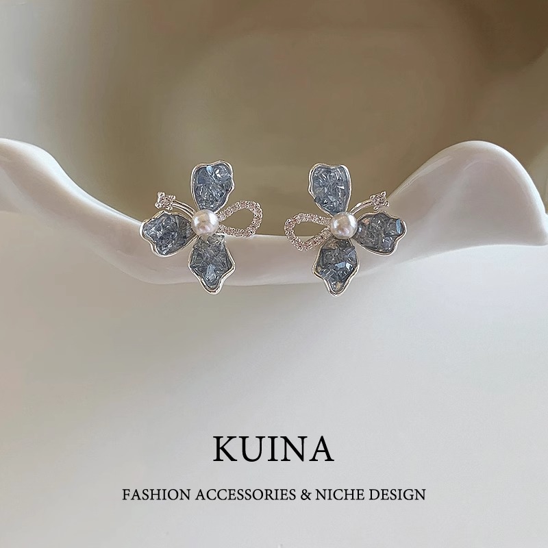 Super Flash Blue Crystal Flower Earrings Sterling Silver Needle High-End Accessible Luxury Pearl Earrings Women's Niche Unique Ear Jewelry