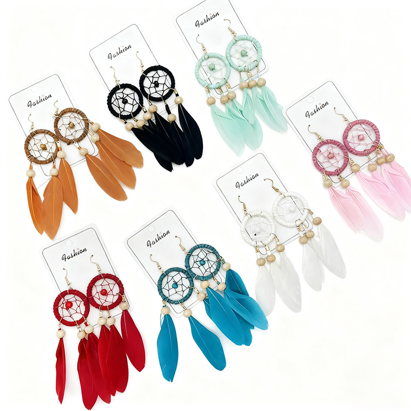 European and American Cross-Border Creative Bohemian Feather Earrings Niche Design Red Ethnic Style Tassel Earrings Wholesale