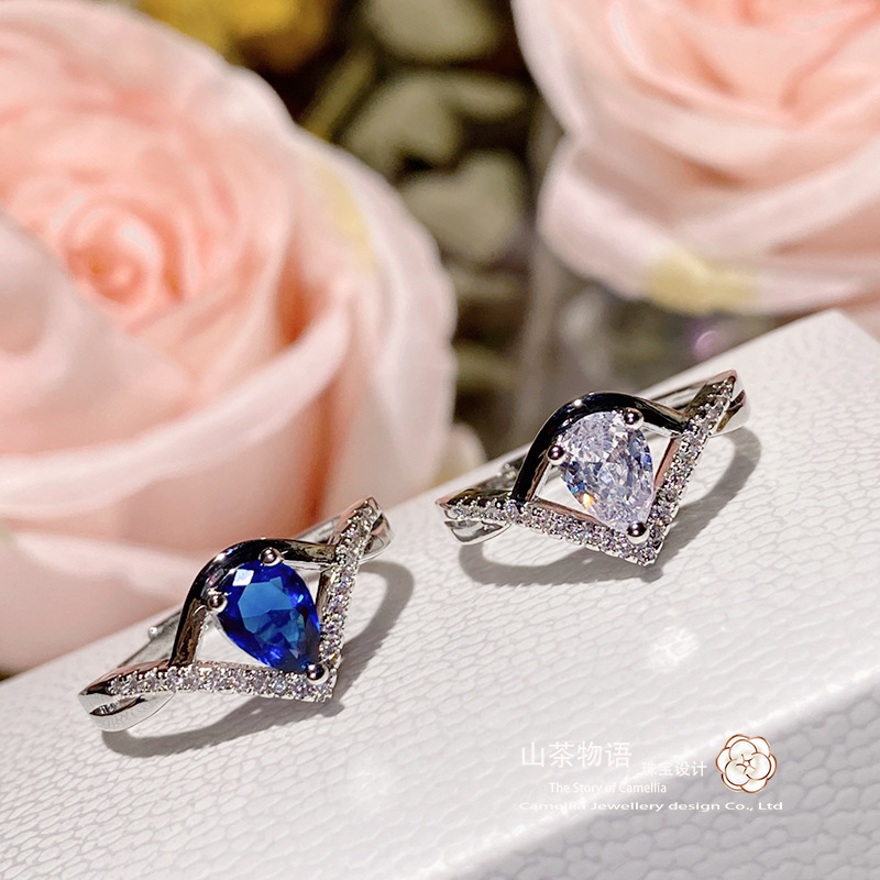 Camellia sweet geometric blue tear drop Ring women's gold-plated retro simple fashion all-match elegant index finger ring