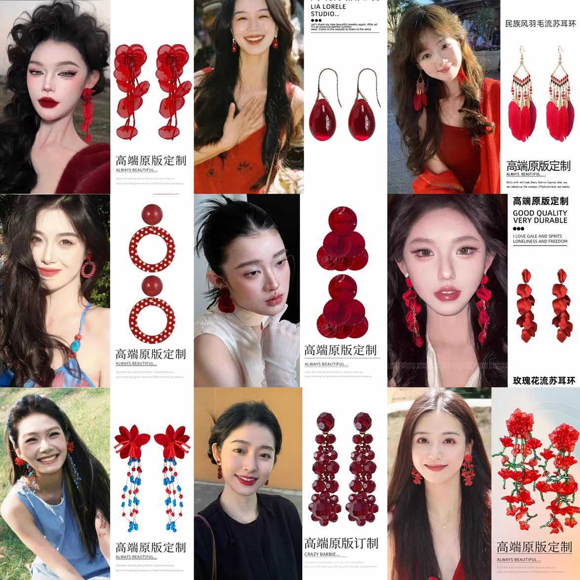 Romantic Utopia Ancora Red Flower Tassel Earrings Atmospheric Long Earrings Light Luxury High-End Earrings