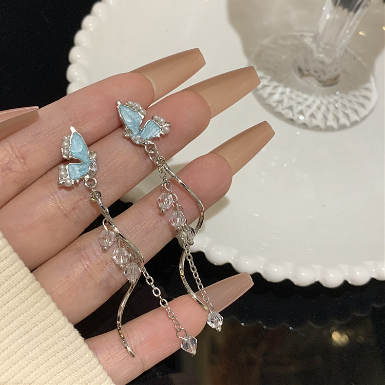 925 Silver Needle Light Blue Butterfly Tassel Earrings Women's Light Luxury High-end Elegant Long Elegant Earrings