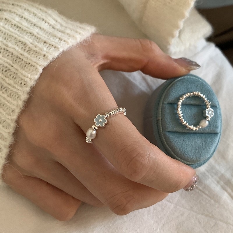 Blue Drop Glaze Flower Imitation Pearl Irregular Ring Women's Light Luxury Fashion All-match Elegant S925 Silver Plated Finger Ring