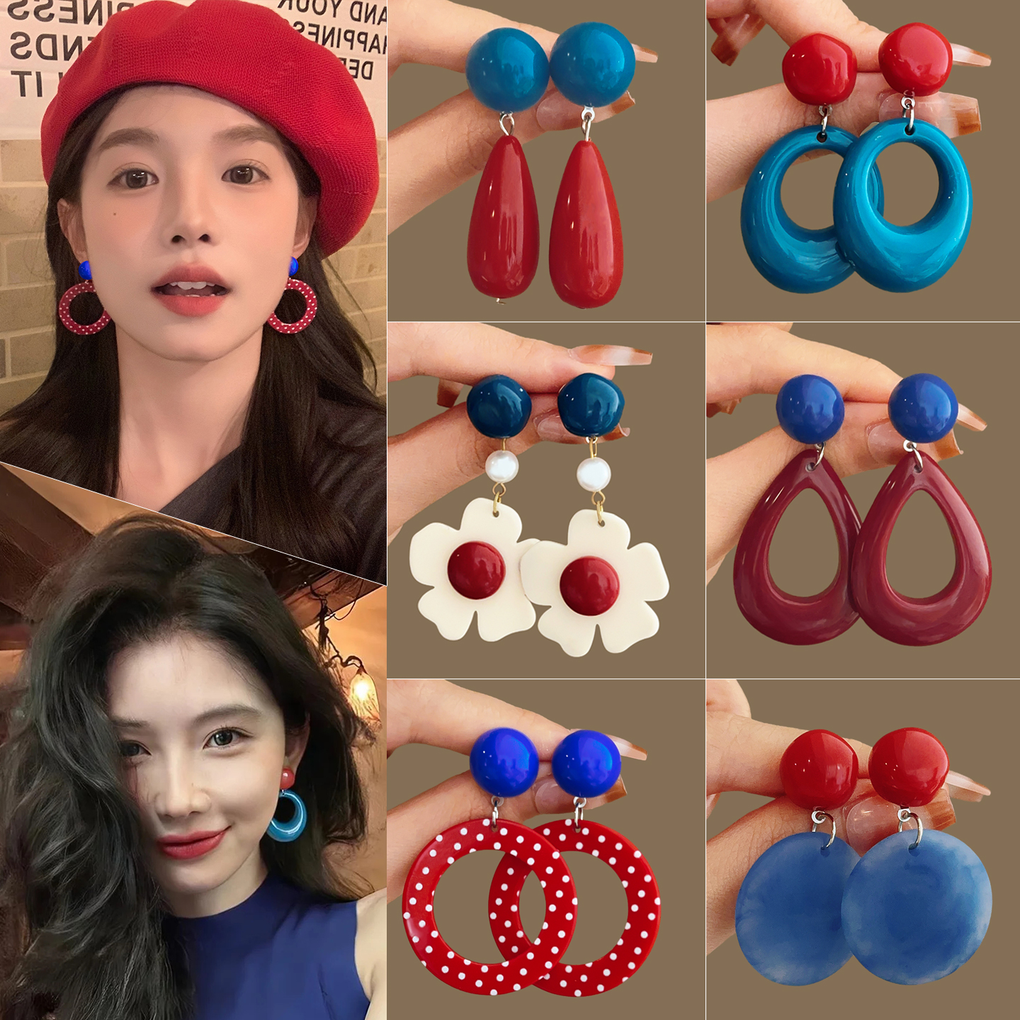 Retro Hong Kong Style Red and Blue Contrasting Color Earrings for Women 2025 New High-End Earrings for Square and Round Faces, Slimming Earrings and Earrings