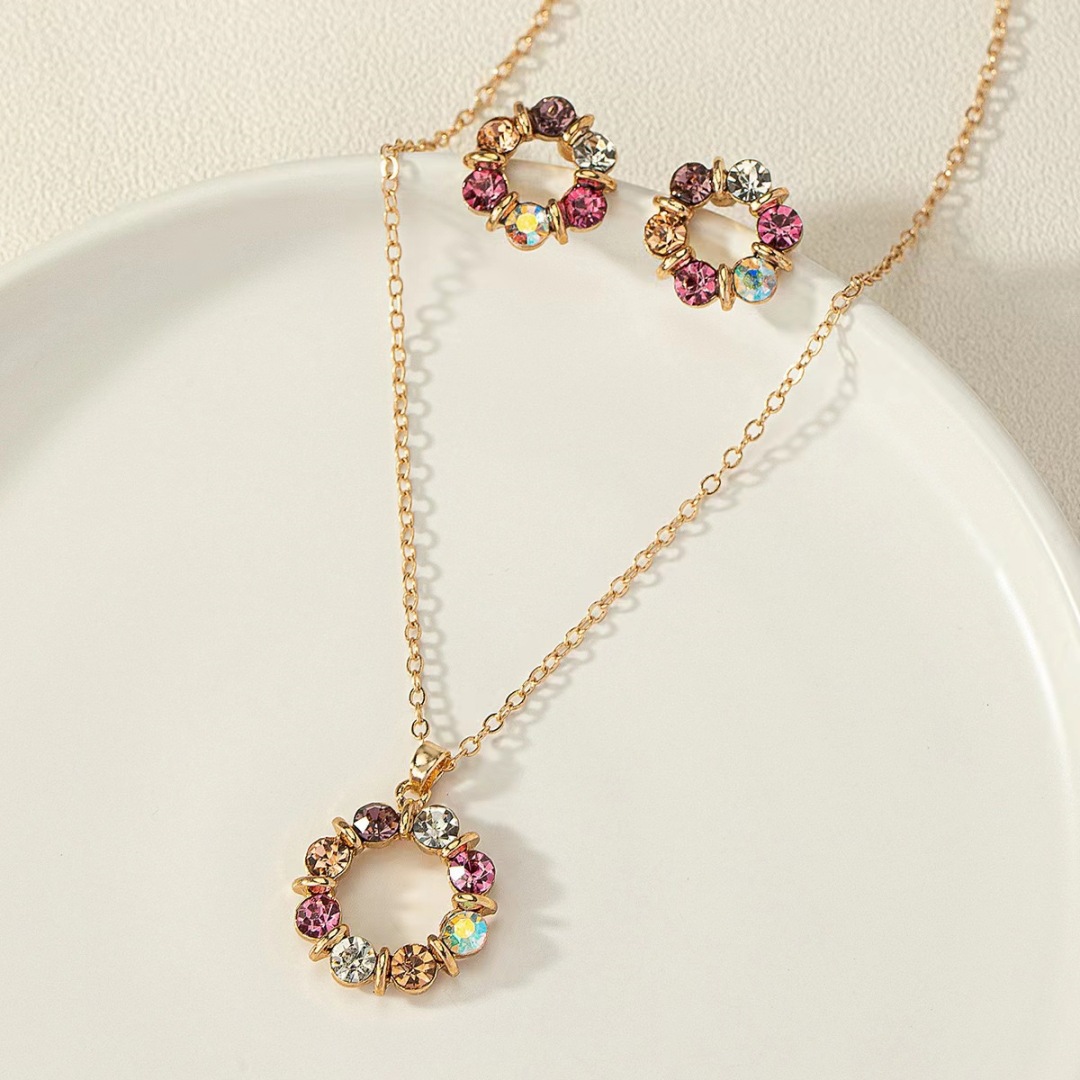 Flower ring jewelry multi-color European and American style jewelry with colored diamond circle design necklace earrings three-piece set wholesale