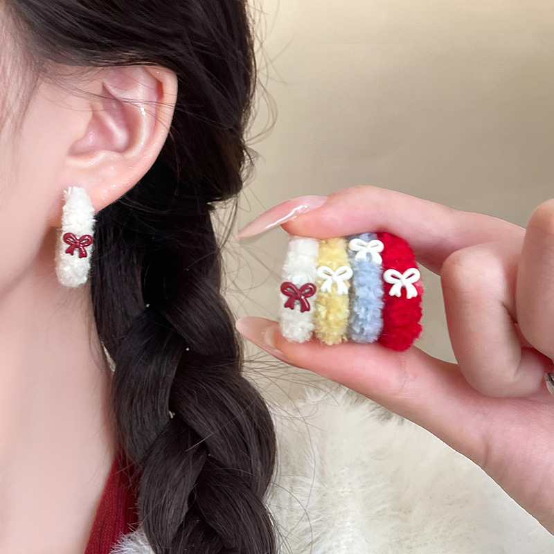 Autumn and Winter Plush Bow Ear Ring Women's Unique Square Round Face Face Small Earrings Ear Buckle Fashion Sweet Personalized Earrings