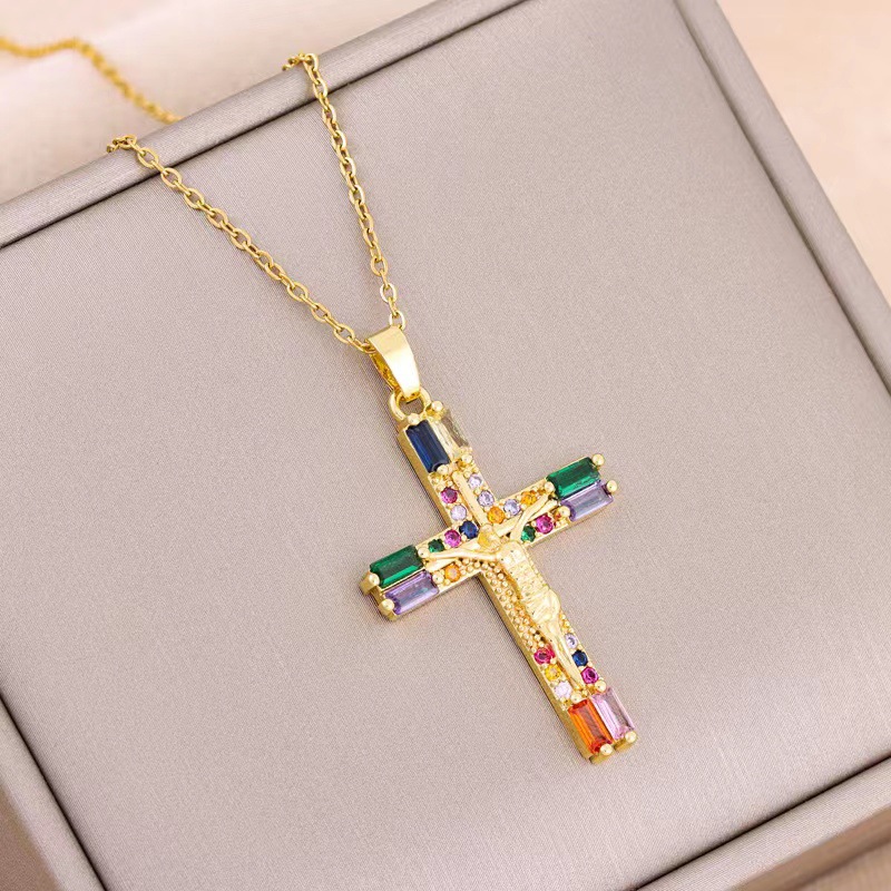 Cross-border New Retro Bohemian Style Color Zirconium Cross Necklace Trendy Women's Alloy Necklace
