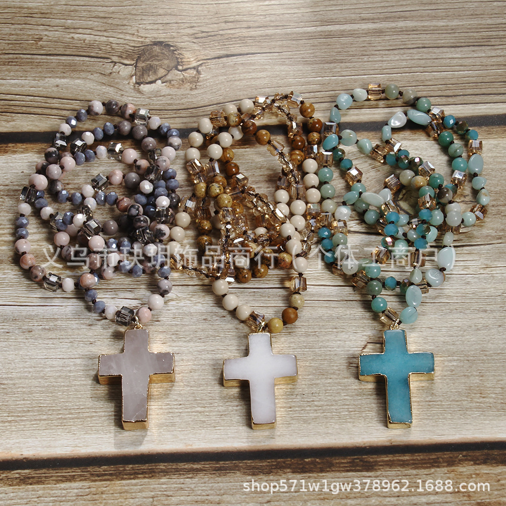 Wholesale Cross-Border Fashion Bohemian Style Necklace Natural Stone Mixed Glass Cross Sweater Chain Necklace